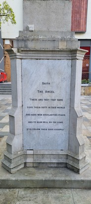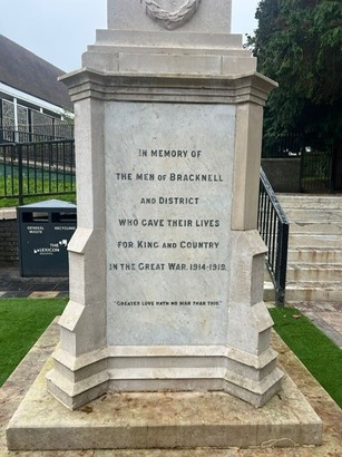 The inscription on the front panel reads: 'In memory of / the men of Bracknell / and district / who gave their lives / for King and Country / in the Great War 1914-1918 / "greater love hath no man than this". The side panels both read, 'And in the World War / 1939-1945'. The rear panel reads: 'Saith / the Angel / "these are they that have / done their duty in this world / and have won everlasting peace; / and ye also will do the same / if ye follow their good example"'.