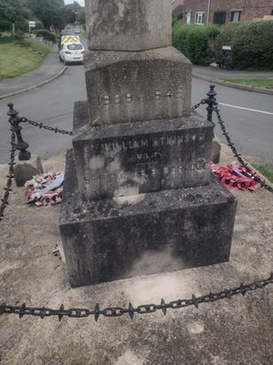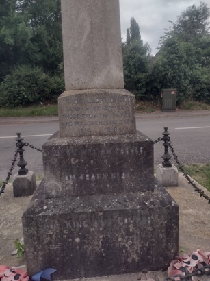 6 o'clock face : TO THE GLORY OF GOD AND IN MEMORY OF THOSE FROM THIS PARISH WHO FELL IN THE GREAT WAR 1914 - 1918. (NAMES) 3 and 9 o'clock faces : (NAMES) 12 o'clock face : 1939 - 1945 / (NAMES)
