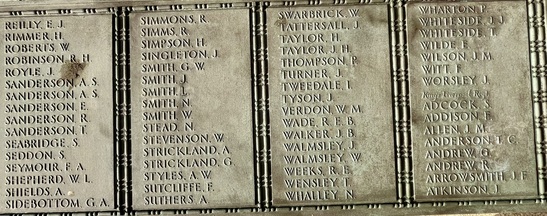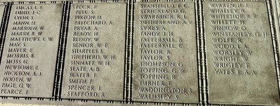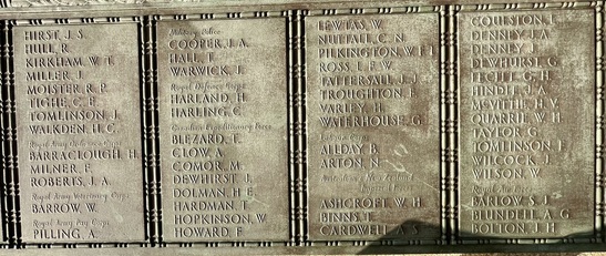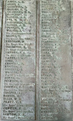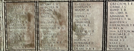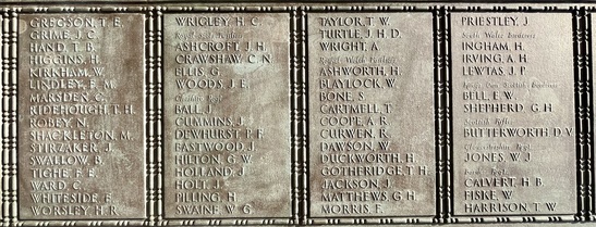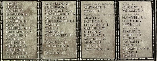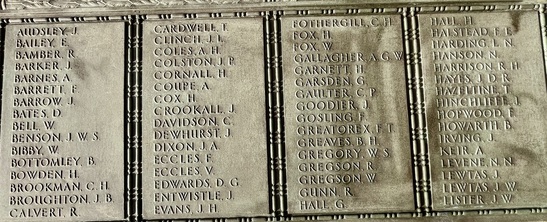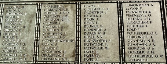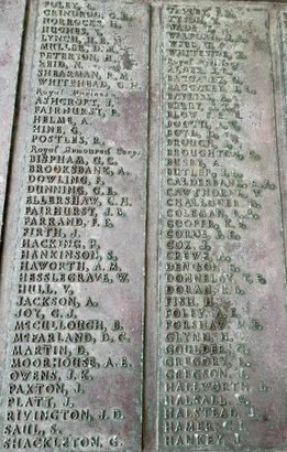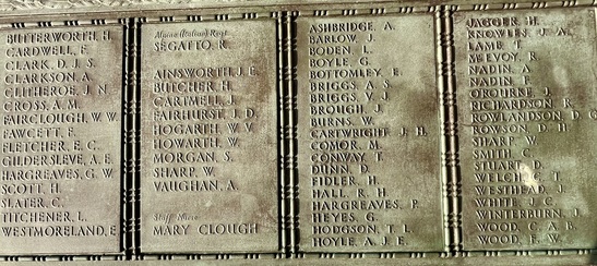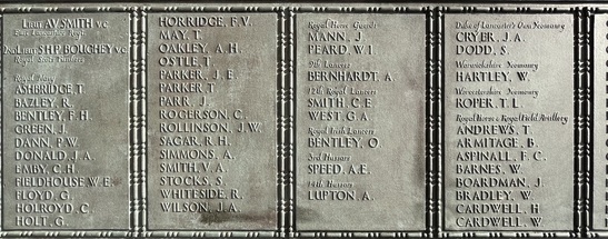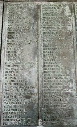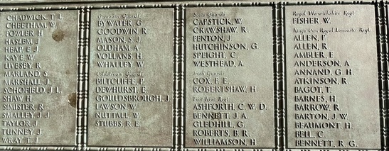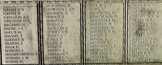 Names Panels show name and service/unit. These names are taken from official records. WW1: Adcock, S., Addison, E., Ainsworth, J.E., Allday, S., Allen, James Matthew, Allen, Percy, Allen, Robert, Ambler, Edmund, Ambler, G.H., Anderson, Alban, Anderson, T.C., Anderson, W., Andrew, G., Andrew, R., Andrews, T., Annand, George H., Armistead, T.C., Armitage, B., Armitt, G., Armitt, J., Arnold, A., Arrowsmith, J.F., Arton, N., Ashbridge, T., Ashcroft, A., Ashcroft, Joseph Henry, Ashcroft, W.H., Ashforth, C.W., Ashridge, A., Ashton, E.S., Ashton, T., Ashworth, F., Ashworth, H., Aspinall, F.C., Aspinall, W.S., Atkinson, J., Atkinson, J.H., Atkinson, Richard, Atkinson, W.P., Audsley, J., Austin, H.A., Bagot, Thomas, Bailey, E., Balderstone, H.H., Ball, J., Bamber, F.W., Bamber, R., Barker, J., Barlow, J., Barlow, S., Barnes, A., Barnes, Harry, Barnes, W., Barraclough, H., Barrett, Fred, Barrett, G.E., Barrow, E., Barrow, J., Barrow, R., Barrow, W., Barton, J., Barton, John Willie, Bates, D., Bates, N., Baylis, A.E., Bazley, R., Beaumont, G., Beaumont, Harold, Bell, Charles, Bell, E.W., Bell, W., Bellarby, H., Bennett, J.A., Bennett, Reginald George, Bennett, W., Benson, J.W.S., Bentley, C., Bentley, F.H., Bentley, O., Bernardt, A., Best, R.J., Bibby, W., Bickerstaffe, J.E., Biltcliffe, P., Binns, T., Birchall, H., Bishop, Arnold, Blackhurst, C., Blacow, R., Blane, S.T., Blaylock, W., Blezard, T., Blundell, A.G., Boardman, H., Boardman, J., Boardman, R., Boden, Lewis, Bolton, J.H., Bone, S., Boothroyd, W., Bottomley, B., Bottomley, E., Boughey, S.H.P., Bowden, Herbert, Bowman, L.J., Boyer, Herbert, Boyle, G., Bradley, E.T., Bradley, Richard, Bradley, W., Braithwaite, J., Briggs, A.S., Briggs, V.J., Broadley, W., Bromwell, J.P., Brooke, William, Brookes, John Robert, Brookman, C.H., Brough, J., Broughton, J.B., Brown, A.H., Buckley, E., Buckley, L., Bullock, W.J., Burns, W., Bury, E., Butcher, H., Butcher, John R, Butler, E., Butler, J., Butler, S., Butterworth, D.V., Butterworth, P., Bywater, G., Callaghan, J., Callow, F.Edward, Calvert, H.B., Calvert, J.N., Calvert, R., Cameron, John Gordon, Campbell, Thomas Alfred, Capstick, W., Cardwell, A.S., Cardwell, Cornelius, Cardwell, E.W., Cardwell, F., Cardwell, F.J., Cardwell, H., Cardwell, John William, Cardwell, T., Cardwell, W., Cardwell, William Henry, Carney, T., Carr, R., Carter, J., Cartmell, G., Cartmell, J., Cartmell, J., Cartmell, J., Cartmell, Robert, Cartmell, T., Cartmell, T., Cartwright, J.H., Caveney, J., Caveney, W., Chadwick, T.L., Cheetham, W., Clark, D.J.S., Clark, G.F., Clarkson, A., Clarkson, Robert E., Clearer, J.R.D., Clegg, J.H.B., Cleghorn, John, Clements, Joseph William, Clinch, J.L., Clitheroe, J.J., Clitheroe, J.N., Clow, A., Coles, A.H., Colston, J.P., Colston, Norman, Comor, M., Comor, M., Conway, T., Cookson, F., Cookson, J., Coope, A.R., Cooper, J.A., Cooper, James, Corbet, E., Cornall, H., Cottam, Lawrence Alfred, Coulston, L., Coulton, J.W., Coulton, Thomas, Coupe, A., Courtman, James, Cowell, E.G., Cowper, Harry Pearson, Cowperthwaite, H ugh C., Cox, F.E., Cox, H., Cox, W.J., Crabtree, J.M., Cragg, Fred., Craig, H., Craig, W.F., Crane, A.R., Crane, J., Crawshaw, C.N., Crawshaw, R., Croasdale, H.H., Croft, G., Crompton, Harold, Crompton, Thomas, Crompton, W.N., Crookall, J., Crosland, Norman Fawcett, Cross, A.M., Cross, J., Cross, James, Crossley, C.E., Crowther, James, Cryer, J.A., Cummins, J., Curwen, J.R., Curwen, R., Dagger, Thomas, Dakin, John, Dann, P.W., Davey, Ernest, Davidson, C., Davies, A.G., Dawson, W., Deane, J.H.F., Degnan, Owen, Denney, J., Denney, J.A., Dennison, E.W., Dewhirst, J., Dewhurst, C., Dewhurst, E., Dewhurst, J., Dewhurst, J.J., Dewhurst, P., Dickie, H., Dixon, J.A., Dochard, A.A., Dodd, S., Dolman, H.E., Donald, J.A., Donohue, James, Doran, S., Doran, William Henry, Douglas, F., Douglas, H., Douglas, W., Doyle, Stanley V., Drew, A.E.E., Drury, A.H., Duckworth, H., Duckworth, Joseph, Dugdale, J., Dunn, D., Eastham, B., Eastham, C.V., Eastwood, Frederick, Eastwood, J., Eastwood, S., Eastwood, Will, Eaves, Edward (Eddie), Eaves, George, Eaves, John, Eccles, Frank, Eccles, V., Edmondson, A. (Robert), Edmundson, W.D., Edwards, D.G., Elliott, H.V., Ellis, C., Elston, Fred, Emby, C.H., English, G.W., Entwistle, J., Evans, J.H., Evans, J.W., Evans, M., Everett, C.F., Fagen, T., Fairclough, W.W., Fairhurst, J.D., Farnworth, Ben, Farrand, H.P., Fawcett, F., Fearnley, Levi Garth, Fegitt, C., Fenton, J., Fidler, H., Fielden, R.W., Fieldhouse, W.E., Fielding, Joseph Henry, Firth, J.O., Fish, E., Fish, H., Fisher, C., Fisher, D., Fisher, W., Fiske, W., Flanaghan, Francis, Fletcher, C.E., Fletcher, E.C., Fletcher, Ernest Norris, Flood, J., Floyd, G., Folds, William Robert, Forbes, G., Ford, Thomas, Forshaw, B., Fothergill, C.H., Fothergill, F.C., Fothergill, George Edward, Fowler, H., Fox, G.R., Fox, H., Fox, W., Friend, H., Frith, J., Furlong, Ernest John, Furnevall, W.H., Furnevall, W.H., Gallagher, A.G., Garnett, Henry, Garratt, G., Garsden, G., Gartside, W., Gaulter, C.P., Gay, J., Gee, A., Gildersleve, A.E., Gledhill, G., Goldbrough, J., Goodall, Norman K., Goodier, J., Goodwin, Josiah Albert, Goodwin, R., Goodwin, W., Gordon, George Arthur, Gormlie, A. Henry, Gosling, F., Gotheridge, George Wilfred, Gotheridge, T.H., Grainger, H., Greaterex, F.T., Greaves, B.H., Greaves, Edward, Greaves, G., Green, Benjamin Haigh, Green, E., Green, H., Green, J., Green, J., Green, William, Greenwood, J.J.J., Gregory, W.S., Gregson, Alfred James, Gregson, R., Gregson, T.E., Gregson, W., Griffiths, Clarence Birch, Grime, J.C., Guest, F., Guest, J.E., Gunn, J., Gunn, R., Hacking, Harold, Hadall, R., Hague, Joseph Eugene, Haley, R.C., Hall, G., Hall, H., Hall, H., Hall, Henry Monton, Hall, R.H., Hall, T., Halsall, Thomas, Halstead, Frank Eversleigh, Hampton, G.F., Hamston, S., Hand, T.B., Hanson, C., Hanson, N., Harding, C., Harding, L.N., Hardman, T., Hare, H., Hargreaves, G.W., Hargreaves, P., Harland, H., Harling, C.,