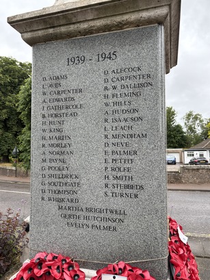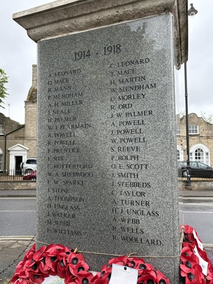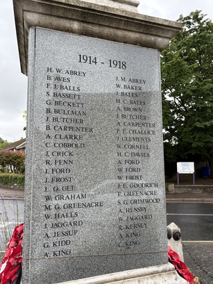 1914-1918 (West face- left column)H.W.ABREY // B.AVES // F.J.BALLS // S.BASSETT // G.BECKETT // B.BULLMAN // J.BUTCHER // B.CARPENTER // A.CLARKE // C.COBBOLD // J.CRICK // R.FENN // J.FORD // J.FROST // J.G.GEEE // W.GRAHAM // M.G.GREENACRE // W.HALLS // J.JAGGARD // A.JESSUP // G.KIDD // A.KING (right column) J.M.ABREY // W.BAKER // J.BALLS // H.C.BATES // A.BROWN // J.BUTCHER // A.CARPENTER // P.E.CHALLICE // J.CLEMENTS // W.CORNELL // H.C.DAVIES // A.FORD // W.FORD // W.FROST // J.E.GOODRICH // F.GREENACE // S.G.GRIMWOOD // A.HENSBY // W.JAGGARD // R.KERSEY // A.KING // C.KING. (East face left column) A.LEOANRD // D.MACE // R.MANN // P.MENDHAM // A.H.MILLER // J.NEALE // H.PALMER // W.J.PEARMAIN // A.POWELL // R.POWELL // F.PRENTICE // E.RIX // C.RUTTERFORD // W.A.SHERWOOD // E.W.SPARKE // J.STONE // A.THOMPSON // H.UNGLASS // J.WALKER // M.WEBB // E.WILLIAMS (right column) C.LEONARD // T.MACE // H.MARTIN // W.MENDHAM // G.MORLEY // R.ORD // J.W.PALMER // A.POWELL // J.POWELL // W.POWELL // S.REEVE // P.ROLPH // O.E.SCOTT // J.MITH // J.STEBBEDS // C.TAYLOR // A.TURNER // H.J.UNGLASS // A.WEBB // R.WELLS // R.WOOLLARD (South face left column) D.ADAMS // L.AVES // W.CARPENTER // A.EDWARDS // J.GATHERCOLE // B.HORSTEAD // H.HUNT // W.KING // H.MARTIN // R.MORLEY // A.NORMAN // M.PAYNE // G.POOLEY // D.SHELDRICK // G.SOUGHGATE // D.THOMPSON // R.WHISKARD (right column) D.ALECOCK // D.CARPENTER // R.W.DALLISON // H.FLEMIG // W.HILLS // A.HUDSON // R.ISAACSON // L.LEACH // R.MENDHAM // D.NEVE // E.PALMER // E.PETTIT // P.ROLFE // H.SMITH // R.STEBBEDS // S.TURNER (at bottom, centrally, three ladies) MARTHA BRIGHTWELL // GERTIE HUTCHINSON // EVELYN PALMER