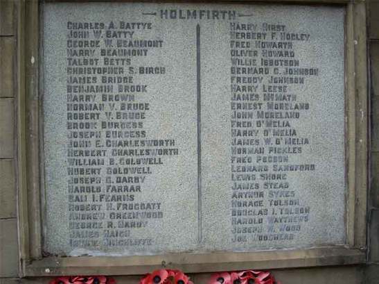 On Cross: Remember. Wall: Left Wing: Holme Valley/1939-1945/Names. Tablet One: Holme & Holmebridge/WW1 Names. Tablet Two: (Column 1) WW1 Names/Underbank/WW1 Names, (Column 2) WW1 Names/Cartworth/WW1 Names. Tablet Three: Holmfirth/WW1 Names. Centre: moulded Crown at top, moulded 1914 on left, moulded 1919 on right. Main dedicatory tablet:In/proud and grateful memory/of these/our sons, who died for/England/in the Great War/1914-1919/the people/of Holme, Holmfirth and/ Newmill/have erected this/monument & hospital/A.D. 1920/Oh England, sometimes think of them/ as they once thought of you. Tablet Four: (Column 1) Upperthong/WW1 Names. (Column 2) Wooldale/WW1 Names. Tablet Five: Netherthong & Thongsbridge/WW1 Names. Tablet Six (Column 1) WW1 Names/ Hepworth & Scholes/WW1 Names. (Column 2) WW1 Names/Hade Edge/WW1 Names. Right Wing: Holme Valley 1939-1945/WW2 Names.