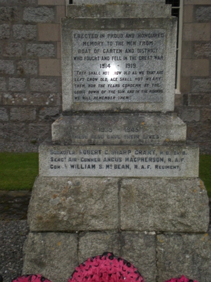 HONOURED / MEMORY TO THE MEN FROM / BOAT OF GARTEN AND DISTRICT / 1914-1919 / "THEY SHALL NOT GROW(sic) OLD AS WE THAT ARE / LEFT GROW OLD, AGE SHALL NOT WEARY / THEM, NOR THE YEARS CONDEMN. AT THE / GOING DOWN OF THE SUN AND IN THE MORNING / WE WILL REMEMBER THEM." 3o'clock face: (Names) 9o'clock face: (Names) Base: 1939-1945 / THEY ALSO GAVE THEIR LIVES / (Names)
