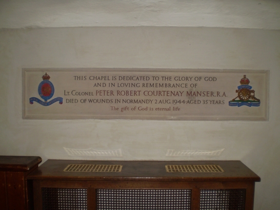 This Chapel is dedicated to the Glory of God and in loving remembrance of Lt. Colonel Peter Robert Courtenay Manser RA Died of Wounds in Normandy 2nd August 1944 Aged 35 Years. The gift of God is eternal life.