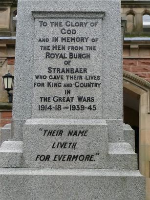 TO THE GLORY OF/ GOD/ AND IN MEMORY OF/ THE MEN FROM THE /ROYAL BURGH/ OF/ STRANRAER/ WHO GAVE THEIR LIVES/ FOR KING AND COUNTRY /IN /THE GREAT WARS /1914 - 1918 1939 - 1945/ "THEIR NAME LIVETH FOR EVER"/ (NAMES) (SIDES AND 12 o'clock face) (WW1 NAMES)/ 1939 - 1945/ (NAMES) 3 o'clock face-IN PEACETIME DUTY/[name] 9 o'clock face-OTHER CONFLICTS/[name]