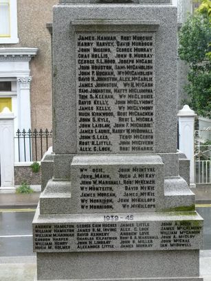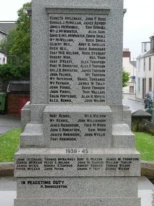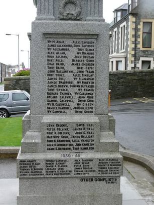 WW1- William M Adair/ James Alexander/ William Alexander/ Alexander Allan/ Hugh Allison/ Robert Auld/ Charles Baird/ Thomas Baird/ John Ballantyne/ Robert Bodle/ James Bradford/ James Brown/ Thomas Bryden/ Richard Cairney/ Roland Caldwell/ Samuel Caldwell/ William H Caldwell/ Samuel Campbell/ William Campbell/ John Caughie/ Peter Collins/ Robert N Collins/ Matthew Cook/ Edward C Crawford/ Alexander S Cuthbertson/ Adair D Davidson/ Alexander Davidson/ John Davidson/ Thomas Dewar/ William Diamond/ Herbert Dunn/ James Emerson/ Robert Espie/ John Fagan/ Alexander Findlay/ William Flanagan/ William Forsyth/ Duncan M Fraser/ William Fraser/ William Galloway/ Adam Gibb/ David Gibb/ William Gibson/ John Gillespie/ David Govan/ David Hall/ James H Hall/ John C Hall/ James Halliday/ Alexander Hamilton/ John Hamilton/ Thomas Hamilton/ James Hannah/ Henry Harvey/ John Higgins/ Charles Hollis/ George SL Hood/ John Houston/ John P Hughan/ David H Johnston/ James Johnston/ Samuel Johnston/ Thomas S Keenan/ David Kelly/ James Kelly/ Hugh Kirkwood/ John S Kyle/ John Laidlaw/ James Laurie/ John S Lees/ Robert H Little/ Alexander C Lock/ William Logie/ John Mann/ John W Marshal/l William Monteith/ James Morgan/ William Morrison/ William Morrison/ Robert Murchie/ David Murdoch/ George Murray/ John B Murray/ Joseph McCabe/ Samuel McCandlish/ William McCandlish/ Alexander McCarlie/ William H McCash/ Matthew McClumpha/ William McCluskie/ John McClymont/ William McClymont/ Robert McCracken/ Robert L McCrea/ John F McCredie/ Harry W McDowall/ Terrence McGeoch/ John McGivern/ Robert McHarrie/ John McIntyre/ Hugh J McKay/ Robert McKenzie/ David McKie/ James McKie/ John McKillops/ William McKillops/ Kenneth McLennan/ Donald J McMillan/ James McWhinnie/ William J McWhirter/ David B McL McWhirter/ William McWilliam/ Gilbert Neil/ Hugh Neil/ Charles McD Nelson/ Robert Nish/ Charles O'Keefe/ Robert W Ormiston/ Uri JB Ormiston/ John Palmer/ William Paterson/ William Patrick/ John Pirrie/ John Pirrie/ Colin Porteous/ Alexander Rennie/ Robert Rennie/ William Rennie/ James Richardson/ John C Robertson/ Joseph Robinson/ Thomas Robinson/ John P Ross/ James Rowden/ Thomas Russell/ Alexander Saul/ Edwin Small/ Hugh Small/ Andrew K Smellie/ Hugh Snodgrass/ Hugh Stewart/ Neil Thom/ Alexander Thompson/ Alexander F Thomson/ James Thomson/ William Thomson/ Daniel Torrance/ James W Tully/ David Tunnock/ Thomas Wallace/ Alan H Whyte/ John Wilson/ William A Wilson/ John Williamson/ Fred M Wood/ Sam Wood/ John Wyllie/ 1939-45- John Arnott/ Reginald W Ault/ James Boyd/ Thomas B Bryson/ William Campbell/ James Calderwood/ Thomas Carswell/ Robert S Casey/ James A Cluckie/ Leonard Cook/ Kenneth C Coulston/ James Coupethwaite/ Alexander Davidson/ John Dewar/ Peter Dicks/ James Dougan/ Thomas Edmunds/ James Espie/ Alexander H Farrell/ Andrew Ferguson/ Robert S Ferguson/ Thomas Galloway/ William Graham/ A Douglas Gray/ Andrew Hamilton/ William Hamilton/ William M Hannah/ Gordon Harper/ William Henry/ Hugh M Holmes/ George Cain Hughes/ James BM Irving/ David Kennedy/ Charles Kilpatrick/ John H Lindsay/ Alexander Little/ James Little/ Alex C Lock/ Andrew Love/ Robert BA Marshall/ John B Miller/ James Murray/ John A Muir/ James McCalmont/ William McCamon/ John A McCloy/ John McCrae/ Ian McDowell/ John McGarrie/ George McKean/ James McKie/ Peter McLean/ Thomas McNairney/ Peter C Nelson/ Robina O'Connor/ John Paton/ Robert H Paxton/ John M Rankin/ Robert Rodger/ Croom P Tait/ James M Thompson/ William Tomlin/ Thomas Wilson/ George Wilson/ Other conflicts (Korea)-TC Hill In Peacetime Duty (Northern Ireland)-H Shingleston