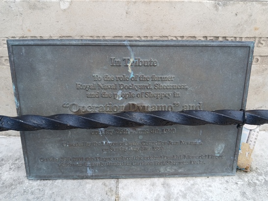 In Tribute/ To the role of the former/ Royal Navy Dockyard, Sheerness,/ and the people of sheppey in/ 'Operation Dynamo' and/ the Evacuation of Dunknirk/ on May 26th-June 4th 1940/ Unveiled by the Mayor of Swale, Councillor Jean Newman,/ on Sunday May 27th 1990/ On May 26th 2001 this Plaque replaced the original Dunkirk Memorial Plaque/ which was formerly situated in Garrison Fort, Sheerness Docks.