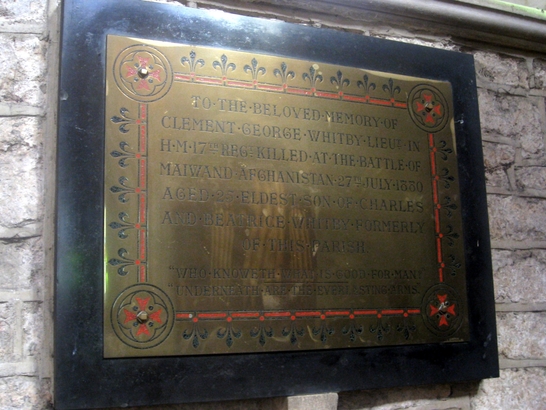 TO THE BELOVED MEMORY OF CLEMENT GEORGE WHITBY LIEUT. IN H.M.17TH REGT KILLED AT THE BATTLE OF MAIWAND AFGHANISTAN 27TH JULY 1880 AGED 25. ELDEST SON OF CHARLES AND BEATRICE WHITBY FORMERLY OF THIS PARISH. "WHO KNOWETH WHAT IS GOOD FOR MAN?" "UNDERNEATH ARE THE EVERLASTING ARMS"