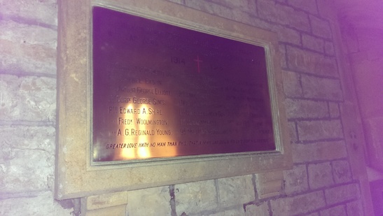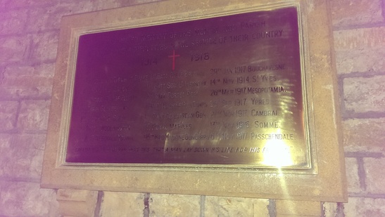In honoured memory of the men of this parish who laid down their lives in the service of their country 1914 - 1918 [Names including rank, regiment, date of death and location] Greater love hath no man than this. That a man lay down his life for his friends.