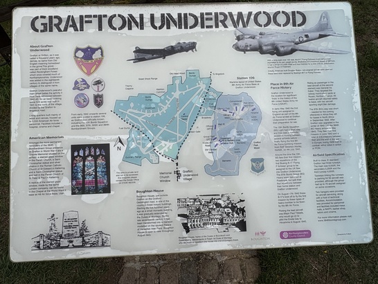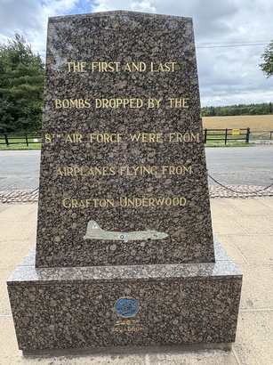 Stone side 1 : THE 384TH BOMBARDMENT GROUP (H) - 8TH AIR FORCE OF THE UNITED STATES OF AMERICA FLEW FROM THIS AIRFIELD 1943 - 1945 Stone side 2 :THE FIRST AND LAST BOMBS DROPPED BY THE 8TH AIR FORCE WERE FROM AIRPLANES FLYING FROM GRAFTON UNDERWOOD. Plinth : 544TH 545TH 546TH 547TH