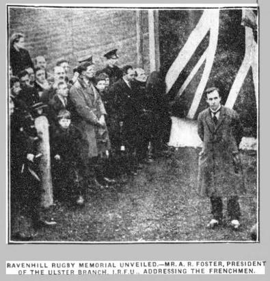 Alec Roulston Foster President of the Ulster Branch I.R.F.U. addresses the crowd at the unveiling of the war memorial at Ravenhill Stadium. - Taken by Published in Larne Times Newspaper 30th January 1926 22 Jan 1926