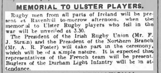 Public notification announcing the official unveiling of the Mmemorial to Ulster Rugby players who fell in the First World War - Taken by Published in the Northern Whig 21st January 1926 21 Jan 1926