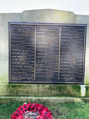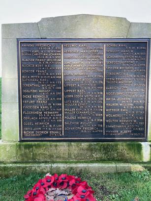 (Names)HIER RUHEN IN GOTT DIE GENANNTEN 51 DEUTSCHEN MAENNER DIE WAEHREND/ DES WELTKRIEGES IN ZIVILGE/ FANGENSCHAFT GESTORBEN SIND (Trans: Here rest in God these 51 German men who, during the World War, died in civilian captivity.)