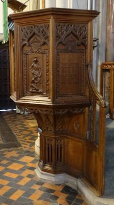 The pulpit in this church was erected by their friends and fellow citizens to the immortal memory of those men who made the supreme sacrifice for their king and country in the Great War AD 1914-1918 and whose names are here inscribed.