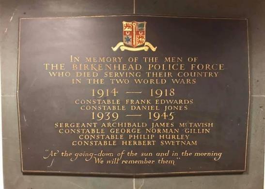 IN MEMORY OF THE MEN OF/ THE BIRKENHEAD POLICE FORCE/ WHO DIED SERVING THEIR COUNTRY/ IN THE TWO WORLD WARS/ 1914-1918/ (2 names)/ 1939- 1945/ (4 names)/ 'AT THE GOING DOWN OF THE SUN AND IN THE MORNING/ WE WILL REMEMBER THEM'