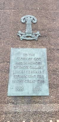 Plaque 1 (Regimental badge) Leicestershire / Prince / Alberts Own / Yeo / South Africa 1900 - 01 Plaque 2 (below Regimental badge) TO THE / GLORY OF GOD / AND IN MEMORY / OF THOSE GALLANT / LEICESTERSHIRE / YEOMAN WHO FELL / IN THE GREAT WAR / 1914 1918 Plaque 3 IN MEMORY OF / ALL OFFICERS, WARRANT OFFICERS, NON-COMMISSIONED / OFFICERS AND MEN OF THE / 153 & 154 (LEICESTERSHIRE YEOMANRY) FIELD REGIMENTS R.A. / WHO FELL IN THE SECOND WORLD WAR / 1939 - 1945