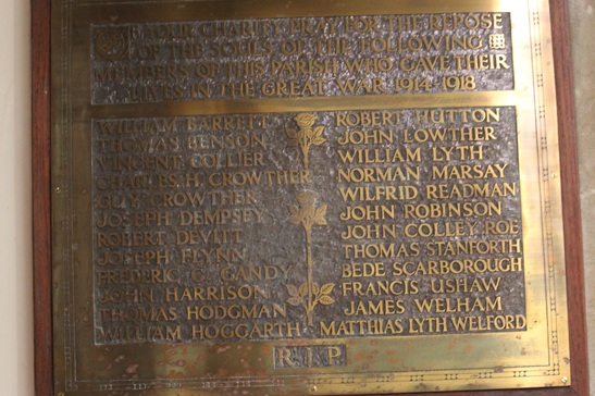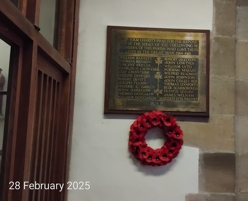 Of your charity pray for the repose of the souls of the following members of this parish who gave their lives in the Great War 1914-1918. In the baptistry to the west of the main south door (these are compass directions as the church is not conventionally orientated)