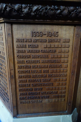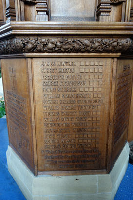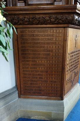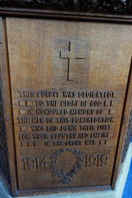 Panel 1: (names) Panel 2: THIS PULPIT WAS DEDICATED/ TO THE GLORY OF GOD/ IN HONOURED MEMORY OF/ THE MEN OF THIS CONGREGATION/ WHO LAID DOWN THEIR LIVES/ FOR THEIR COUNTRY AND EMPIRE/ IN THE GREAT WAR/ 1914 1918 Panel 3: (total of 34 WW1 names between the 2 panels)/ "We look for the resurrection of the/ dead and the life of the world to come"/"THeir name liveth for evermore"/ ERECTED 1920 Panel 4: 1939 - 1945/ (14 names)