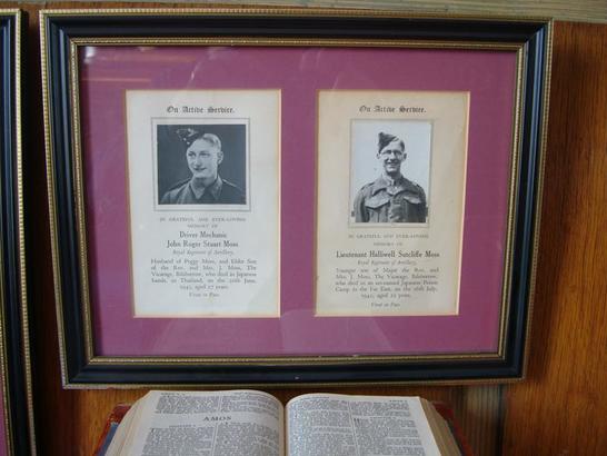 On active service in grateful and loving memory of Driver Mechanic JOHN ROGER STUART Moss Royal Regiment of Artillery/Husband of PEGGY MOSS and elder son of Rev.and Mrs J.Moss The Vicarage Bilsborrow who died in Japanese hands in Thailand on the 20th June 1943 aged 27/ Fivat in Pace/ On active service/In grateful and loving memory of/Lieutenant Halliwell Sutcliffe Moss Royal Regiment of Artillery Younger son of Major the Rev and Mrs J Moss The Vicarage Bilsborrow who died in an un-named Japanese Prision Camp in the Far East on the 16th July 1942 aged 23 years Fivat in Pace