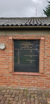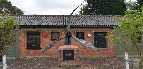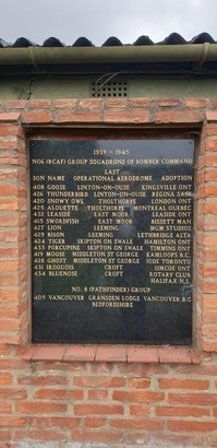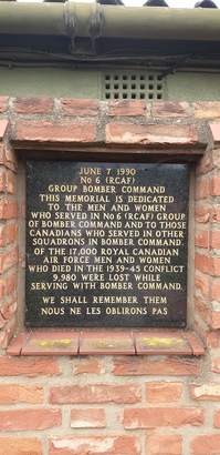 (ON PROPELLOR PLINTH) IN EVERLASTING HOMAGE/ TO THE COURAGE OF THOSE/ WHO HAVE FOUND THEIR/ WINGED VICTORY/ THROUGH THE SKIES/ OF YORKSHIRE/ R J SAGE (TABLET 1 ON WALL) 1939 - 1945/ NO 6 (R.C.A.F) SQUADRONS OF BOMBER COMMAND/ 408, 426, 420, 425, 432, 415, 427, 429, 424, 433, 419, 428, 431, 434 SQUADRONS) (TABLET 2 ON WALL) JUNE 7 1990/ NO 6 (R.C.A.F./ GROUP BOMBER COMMAND/ THIS MEMORIAL IS DEDICATED/ TO THE MEN AND WOMEN/ WHO SERVED IN NO 6 (RCAF) GROUP/ OF BOMBER COMMAND AND TO THOSE/ CANADIANS WHO SERVED IN OTHER/ SQUADRONS IN BOMBER COMMAND/ OF THE 17,000 ROYAL CANADIAN/ AIR FORCE MEN/ WHO DIED IN THE 1939 - 1945 CONFLICT/ 9,980 WERE LOST WHILE/ SERVING WITH BOMBER COMMAND/ WE SHALL REMEMBER THEM/ NOUS LES OBLIRONS PAS (TABLET 3 ON WALL) HERE WAS / STATIONED / 1944 - 1945 / GROUPEMENT / DE / BOMBARDEMENT / NO 1 / COMPRISING THE / FRENCH SQUADRONS / GUYENNE AND / TUNISIE / RAF SQUADRONS / 346 347 / ICI STATIONNA EN / 1944 - 1945 / LE GROUPEMENT / NO1 / COMPRENANT LES / GROUPES FRANCAIS / GUYENNE ET / TUNISIE / SQUADRONS DE LA RAF / 346 347 / THIS MONUMENT RECALLS / THEIR BATTLES AND THE / SACRIFICE OF THEIR DEAD / CC MONUMENT RAPPELLE / LEURS COMBATS ET LE / SACRIFICE DE LEURS MORTS (TABLET 4 ON WALL) THEY MADE THE SACRIFICE/ SUPREME./ SO THAT YOU AND I/ MAY GO IN PEACE, WITH FREEDOM/ 4 GROUP./ 1939 - 1945 (TABLET 5 ON WALL) ROYAL AIR FORCE/ 4 GROUP BOMBER COMMAND/ YORKSHIRE/ SQUADRONS 1939 - 1945/ ROYAL AIR FORCE 10, 35, 51, 58, 76, 77, 78, 102, 104, 158, 578, 640/ ROYAL AUSTRALIAN AIR FORCE/ 462, 466/ ROYAL CANADIAN AIR FORCE 405/ FRENCH AIR FORCE 346, 347
