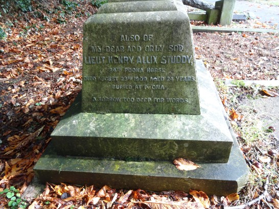 Also of / My dear and only son / Lieut. Henry Allix Studdy, / 34th. Poona Horse / died August 23rd. 1909, aged 24 years. / Buried at Poona. / "A sorrow too deep for words."