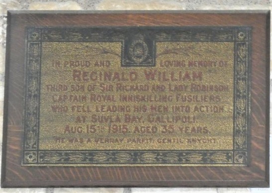 IN PROUD AND LOVING MEMORY OF/ REGINALD WILLIAM/ THIRD SON OF SIR RICHARD AND LADY ROBINSON/ CAPTAIN ROYAL INNISKILLING FUSILIERS/ WHO FELL LEADING HIS MEN INTO ACTION/ AT SUVLA BAY, GALLIPOLI./ AUG. 15TH 1915. AGED 35YEARS./ HE WAS A VERRAY PARFIT GENTIL KNYGHT