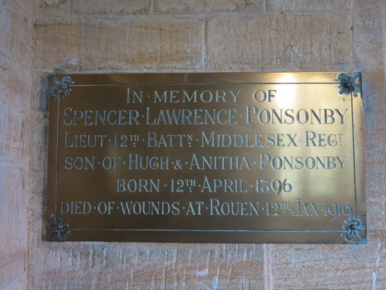 In memory of/ Spencer Lawrence Ponsonby/ Lieut 12th Battn. Middlesex Regt./ son of Hugh & Anitha Ponsonby/ born 12th April 1896/ died of wounds at Rouen 12th Jan 1916