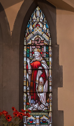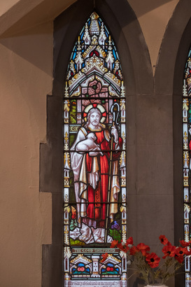 Left light: THE GOOD SHEPHERD; Right light: THE LIGHT OF THE WORLD; Scroll across foot of left light: To the Glory of God, and in memory of 2nd. Lieut./ Victor Greaves, age 29, Duke of Wellingtons Regt; Scroll across foot of right light: Died in France Nov. 28th. 1917 of wounds received/ in action the previous Day at Bourlon Wood; Near foot of left light: ROBERTSON & RUSSELL. SHEFFIELD