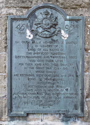 45th/FOOT 95th/FOOT/ ON CRICH HILL A MONUMENT IS ERECTED/ IN MEMORY OF/ 11,409 OF ALL RANKS OF/ THE SHERWOOD FORESTERS/ (NOTTINGHAMSHIRE AND DERBYSHIRE REGT.)/ WHO GAVE THEIR LIVES/ FOR THEIR KING AND THEIR COUNTRY/ IN THE GREAT WAR 1914 - 1919/ WHOSE NAMES/ ARE RECORDED WITH GRATITUDE AND LOVE IN/ BOOKS OF REMEMBRANCE/ DEPOSITED IN NOTTINGHAM AND DERBY/ AND ALSO IN HONOUR OF/ ALL THEIR COMRADES WHO GLORIOUSLY SERVED/ IN 32 BATTALIONS OF THE SAME REGIMENT/ TO THE NUMBER OF/ 140,000.