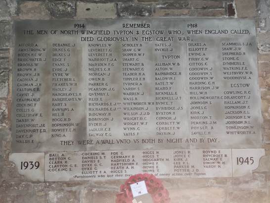 1914 REMEMBER 1918/ THE MEN OF NORTH WINGFIELD TUPTON & EGSTOW WHO, WHEN ENGLAND CALLED/ DIED GLORIOUSLY IN THE GREAT WAR/ (names)/ TUPTON (names)/ EGSTOW (names)/THEY WERE A WALL UNTO US BOTH BY NIGHT AND BY DAY/ 1939 - 1945/ (34 names of whom 11 are Civilians)/ *PARISHIONERS WHO LOST THEIR LIVES AS A RESULT OF ENEMY ACTION OVER TUPTON