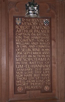 To the beloved memory of Robert Stafford Arthur Palmer Captain 6th Battall- ion The Hampshire Regiment * Son of William and maud 2nd Earl and Countess of Selborne born 26th September 1888 killed in action in Mesopotamia in the battle of Um-El-Hannah January 21st 1916 Nor love thy life nor hate but what thou liv'st * live well * how long or short permit to heaven