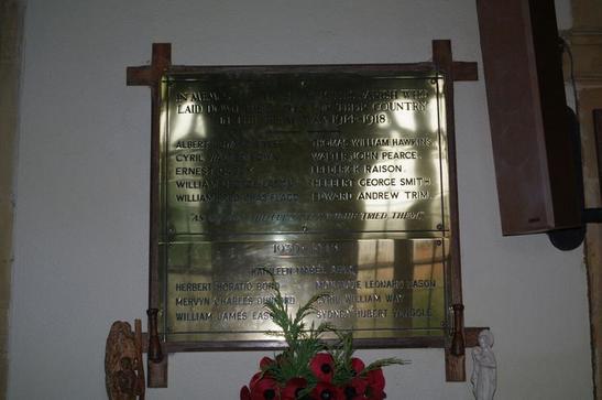 Plaque 1: IN MEMORY OF THOSE OF THIS PARISH WHO / LAID DOWN THEIR LIVES FOR THEIR COUNTRY / IN THE GREAT WAR 1914 -1918. / (10 NAMES) / "AS GOLD IN THE FURNACE HATH HE TRIED THEM." / Plaque 2: 1939 -1945 / (7 NAMES)