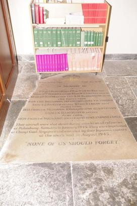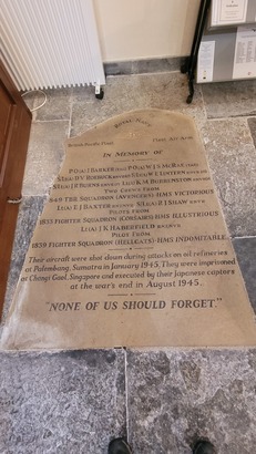 ROYAL NAVY/ BRITISH PACIFIC FLEET FLEET AIR ARM/ IN MEMORY OF/ (Names)/ THEIR AIRCRAFT WERE SHOT DOWN DURING ATTACKS ON OIL REFINERIES/ AT PELAMBANG, SUMATRA IN JANUARY 1945. THEY WERE IMPRISONED/ AT CHANGI GAOL, SINGAPORE AND EXECUTED BY THEIR JAPANESE CAPTORS/ AT THE WAR'S END IN AUGUST 1945./ "NONE OF US SHOULD FORGET"