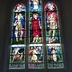 Three panel stained glass window by Morris & Co with portraits of Christ and various saints. Panel 1: An kneeling angel with a musical instrument in the upper arched segment, a full length figure of a...