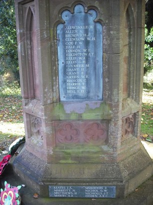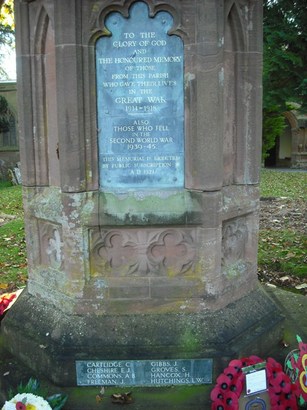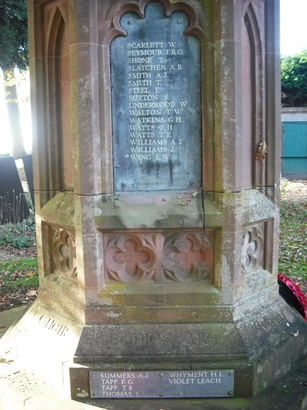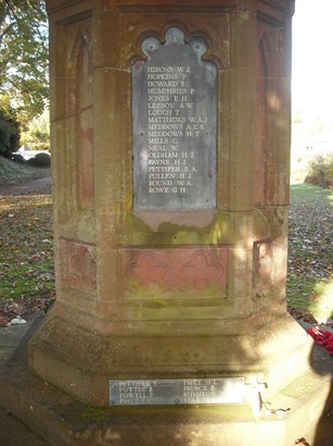 Names listed for WW1 : Aldwinkle W, Allen A, Bromwich F, Clewlow W H, Cox F W, Dale H, Dodson W E, Elkington J T, Ellis W J, Ellis G H, Goodyer M, Grant H, Grant E, Green W E, Hancox C, Harris T, Hence W, Hill L H, Hirons W J, Hopkins F, Howard S, Humphries P, Jones E H, Leeson A W, Louch T, Matthews W A J, Meddows A E S, Meddows H T, Mills G, Neal W, Oldham H J, Payne H J, Pettifer S A, Pullen H J, Round W A, Rowe G H, Scarlett W, Seymour J R G, Shone T, Slater A B, Smith A J, Smith T, Steel E, Sutton S, Underwood W, Walton T W, Watkins G H, Watts C H, Watts T E, Williams A J, Williams J, Wing L W. // WW2 : Carlidge C, Cheshire E J, Commons A B, Freeman J, Gibbs J, Groves S, Hancox H, Hutchings L W, Keates J A, Leach Violet, Marriott N, Matthews H, Mawby K R, Muldoon J, Nichol G W, Nicholls J T, Ogden A R C, Pettifer S, Potter J, Powell P, Price E I, Price H L, Prince E, Rushton W, Starmer E E, Summers A J, Tapp F G, Tapp T R, Thomas L, Whyment H L.