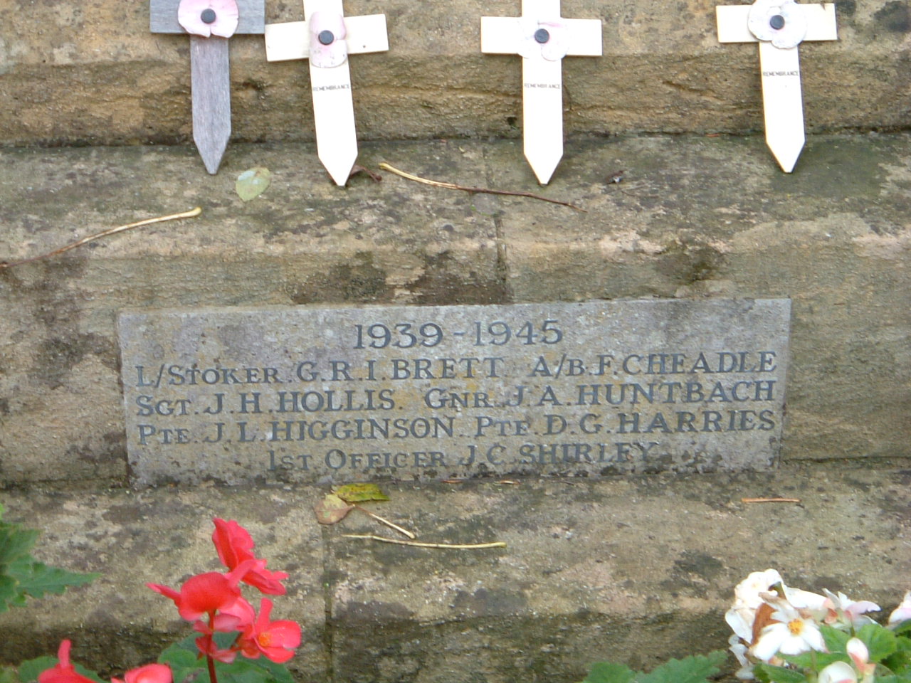 Great War - Captain Edward Nugent Bankes, Trooper Percy Edgar Bowen, Lance Corporal Stanley Waterton Cook, Lieutenant Reginald Ernest Melly, Private John Herbert Massey, Private Louis Callow, Second Lieutenant Kenneth Selby Waters, Private Leonard Russell, Private Joseph Albert Jeffcott, Lance Corporal Phillip West, Captain Edgar Godfrey Izon, Gunner George Davies, Private George Harold Timms Poole Second World War - Leading Stoker Geoffrey Ralph Ingersoll Brett, Gunner James Arthur Huntbach, First Officer John Charles Shirley, Sergeant John Henry Hollis, Private Douglas Glynn Harries, Private John Leslie Higginson, A/B F Cheadle