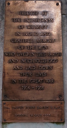 Erected by the inhabitants of Walmley in proud and grateful memory of the men who lived in this parish and neighbourhood and laid down their lives in the Great War 1914 - 1918, WW2 1939 - 1945, Bosnia 1996