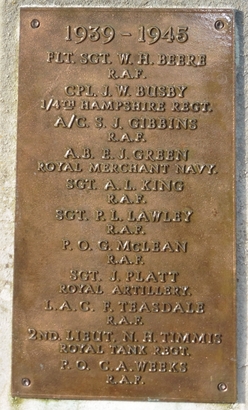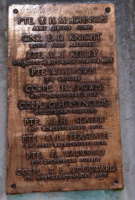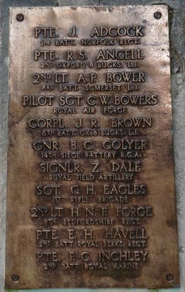 1914 - 1918Pte J. Adcock, 1-4 Bn Norfolk Regt; Pte R.S. Angell, 2nd Oxford & Bucks L.I.; 2nd Lt. A.P. Bower; 3rd Bn Somerset L.I.; Pilot Sgt. C.W. Bowers, Royal Air Force.; Corpl. J.R. Brown. 5th Bn Oxford & Bucks L.I.; Gnr. B.C. Coyler, 14th Siege Battery, R.G.A.: Signlr. Z. Dale, Royal Field Artillery.; Sgt. G.H. Eagles, 1st Rifle Brigade.; 2nd Lt. H.N.F. Forge, 8th Bedfordshire Regt.; Pte. E.H. Havell, 2nd Bn. Royal Berks. Regt.; Pte. P.C. Hinchley, 2nd Bn. Royal Marin.; Pte. W.H.M. Johnson, Army Service Corps.; Gnr. E.D. Knight, Royal Field Artillery; Pte. V.J. Kelly, 1-10 (Scottish) Bn. Kings Liverpool Regt.; Pte. W. H. Powis, 9th Lancers Corpl. H Powis, 6th Lincolnshire Regt.; Corpl. G.H. Reynolds, Coldstream Guards; Pte. J.H. Slater, 2nd Worcestershire Regt.; Pte. B.L. Teasdale, 2-6 Royal Warwickshire Regt.; Pte. F. Warwood, 2nd Coldstream Guards; Corpl. R.L. Woodward, 7th Northamptonshire Regt. 1939 - 1945 Flt. Sgt. W. H. Beere, Royal Air Force; Cpl J.W. Busby, 1-4th Hampshire Regt.; A/C S. J. Gibbens, Royal Air Force; A.B. E. J. Green, Royal Merchant Navy; Sgt. A.L. King, Royal Air Force; Sgt. P.L. Lawley, Royal Air Force; P.O. G. Mclean, Royal Air Force; Sgt. J. Platt, Royal Artillery; L.A.C. F. Teasdale, Royal Air Force; 2nd Lieut. N.H. Timmis, Royal Tank Regt.; P.O. G. A Weeks, Royal Air Force. Bosnia 14 May 1996 Pte. David John Baird, R.L.C.