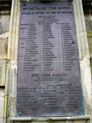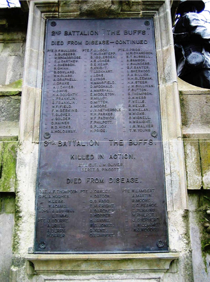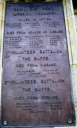 TO THE GLORIOUS MEMORY AND IN GRATEFUL/ REMEMBRANCE OF THE DEVOTED AND HEROIC SERVICE/ OF THE OFFICERS NON COMMISSIONED OFFICERS AND MEN OF/ THE BUFFS - EAST KENT REGIMENT/ AND OF THE/ IMPERIAL YEOMANRY OF EAST KENT/ WHO GAVE THEIR LIVES IN THE COUNTRY'S CAUSE/ DURING THE WAR IN SOUTH AFRICA 1899 - 1902/ THIS MEMORIAL HAS BEEN ERECTED BY THEIR COM/ -RADES IN ARMS BELONGING TO EAST KENT REGIMENTS/ AND BY THEIR SORROWING FRIENDS IN THE COUNTY(SIDES AND REVERSE)/ (NAMES)