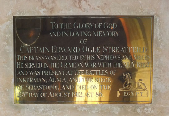To the Glory of God and in loving memory of Captain Edward Ogle Streatfield this brass was erected by his nephews and nieces. He served in the Crimean War wit hthe XLIVth Regt and was present at the Battles of Inkerman, Alma and the seige of Sebastopol, and died on the 28th day of August 1912 AET 86.
