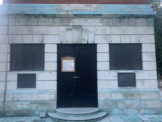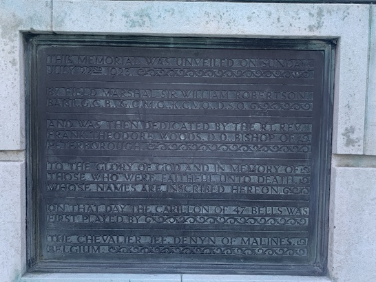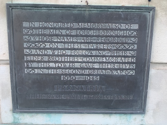 Base wall of tower : THIS TOWER WAS ERECTED IN GRATEFUL MEMORY OF THE MEN OF LOUGHBOROUGH / WHO GAVE THEIR LIVES FOR FREEDOM IN THE GREAT WAR, 1914-1918. // Plaque 1 : THIS MEMORIAL WAS TRANSFERRED TO THE MAYOR, / ALDERMAN AND BURGESSES OF THE BOROUGH OF / LOUGHBOROUGH, BY THOSE WHO SUBSCRIBED FOR / ITS COST, ON SUNDAY, JULY 22ND. 1923. <><><><> / AT ITS TRANSFER THE FOLLOWING CHARGE WAS / GIVEN:- <><><><> / " WE CHARGE YOU TO HAND ON THE DUTY AND / PRIVILEGE OF MAINTAINING AND PRESERVING / THIS GREAT MEMORIAL, SO THAT GENERATIONS / YET UNBORN MAY BE REMINDED OF THE SACRIFICE / WHICH THESE MEN MADE, AND OF THE GREAT / PRINCIPLES FOR WHICH THEY DIED." <><><><> / THIS CHARGE WAS ACCEPTED BY THE MAYOR IN / THE FOLLOWING WORDS:- <><><><> / " I ACCEPT ON BEHALF OF THE ALDERMEN AND / BURGESSES OF THIS BOROUGH THE GIFT OF THIS / MEMORIAL TOWER AND CARILLON. ITS CARE SHALL / EVER BE THEIR SOLEMN TRUST AND PRIVILEGE. " // Plaque 2 : THIS MEMORIAL WAS UNVEILED ON SUNDAY, / JULY 22ND, 1923, <><><><> / BY FIELD MARSHAL SIR WILLIAM ROBERTSON, / BART., G.C.B., G.C.M.G., K.C.V.O., DSO. <><><><> / AND WAS THEN DEDICATED BY THE RT. REV. / FRANK THEODORE WOODS, D.D., BISHOP OF / PETERBOROUGH, <><><><> / TO THE GLORY OF GOD AND IN MEMORY OF / THOSE WHO WERE FAITHFUL UNTO DEATH, / WHOSE NAMES ARE INSCRIBED HEREON. <> / ON THAT DAY THE CARILLON OF 47 BELLS WAS / FIRST PLAYED BY <><><><> / THE CHEVALIER JEF. DENYN OF MALINES, / BELGIUM. <><><><> // Plaques 3, 4, 5 & 6 : (WW1 NAMES). // Plaque 7 : IN HONOURED MEMORY ALSO OF / THE MEN OF LOUGHBOROUGH / WHOSE NAMES ARE RECORDED / ON THESE TABLETS / AND WHO, FOLLOWING THEIR / ELDER BROTHERS COMMEMORATED / BY THIS TOWER, GAVE THEIR LIVES / IN THE SECOND GREAT WAR / 1939-1945 / PRO PATRIA / THEIR NAME LIVETH FOR EVERMORE // Plaques 8 & 9 : (WW2 NAMES) // Plaques 10, 11 & 12 : (Post 1945 NAMES)