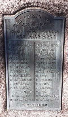 WW1: T. Alderman, H. Biswell, J. Biswell, G. Brown, F. Charge, A. Chisman, T, Childs, G. De Beger, A.M. Durrant, H. Freeman, F. Freeman, G. Goodenough, J. Hallett, F. Harrowell, J. Knox Hart, F. Johnson, B. Oakley, W. Parkins, V. Perkins, W.W. Sears, R.H. Secretan, H. Smith, F. Taylor, E. Thorn, G. Timson, W. Webb, H. Woodwards, H. Wombwell, B.W. Wright. WW2: Harry Bagshaw, Gordon S. Clear, Frank Coker, Arthur Collins, Fred Cother, George W. Faulder, Archie E. Faulder, Jack Newland, James Rogers.