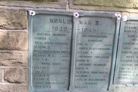 6 o'clock face of pedestal: IN MEMORY OF THOSE/ WHO FOUGHT/ AND DIED/ IN TWO WORLD WARS/ 1914 - 1918/ 1939 - 1945/ THEIR NAME LIVETH/ FOR EVERMORE Plaque a: (Names) Plaque c: (Names) Plaque d: (Names) Plaque f: (Names) Plaque b: WORLD WAR II./ 1939. - 1945./ (Names) Plaque e: WORLD WAR II./ 1939. - 1945./ (Names)