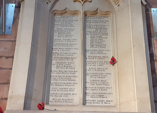HMS Dragon/Joseph Walker AB/Royal Field Artillery/Lieut G H Newbold/Lieut G A Pilcher/Gunner Joseph Gwilt/Gunner Charles R Jones/Royal Engineers/Sergt Henry G Stoyle/Spr Edward Dove/Spr William Jones/Spr Albert Tanswell/Spr Harry Morris/Royal Flying Corps/2nd Lieut C F Pritchard/Coldstream Guards/Pte Thomas Groves/Royal West Surrey Regt/Pte A G Barlow/Kings Liverpool Regt Pte William Croxton/Bedfordshire Regiment/Sergt Albert Sirrell/Cheshire Regt/Pte A W H Carter/Pte Harry Nicholas/Pte Herbert M Owen/Royal Welsh Fusiliers/Pte John Morris Owen/South Wales Borderers/Capt J B Blaxland/L/Cpl Clement Beddoes/Gloucestershire Regt/Pte Edward Edwards/East Surrey Regt/Lieut H Stanley Webb/South Lancashire Regt/Pte Harold Clift/Welsh Regiment/Pte William F Pyeman/Notts & Derby Regt/Pte Francis Harris/Royal West Kent Regt/Sergt Benjamin Shaw/Kings Shropshire LI/Capt S G Beaumont/2nd Lieut Ronald Pugh/2nd Lieut John W Jones/Sergt James McLean/L/Cpl Walter H Stanley/Pte Frederick L Bedell/Pte Alan Gough/Pte Wilfred Holbrook/Pte Alfred Jones/Pte John Peplow/Pte R Pursell Price/Pte John Smallwood/Pte Alfred E Young/Kings Royal Rifle Corps/Pte Ernest Abbot/Pte Harry Woolrich/Wiltshire Regt/Lieut R S Galliers/Manchester Regt/Lieut W E S Owen MC/Sergt-maj S Hall/Rifle Brigade/Capt C W Jenkins/Machine Gun Corps/Pte Arthur E Dixon/Pte Percy Passant/London Regt/ Pte Henry C Lambert/Pte John Yaxley Ragge/Herefordshire Regt/Pte Charles E Bedell/Royal Army Service Corps/Pte Carl Crippen/Pte Herbert H Birch/34th Fort Garry Horse/Corpl Arthur R Birch