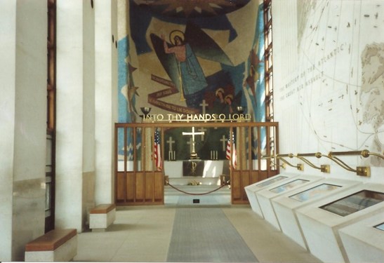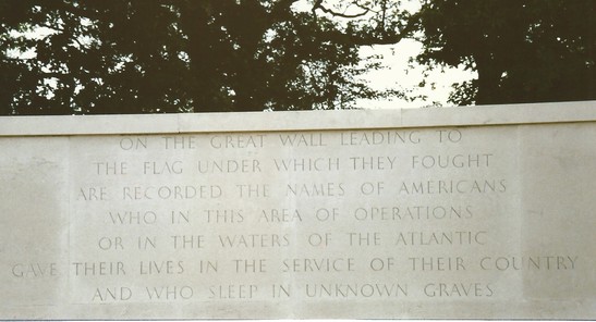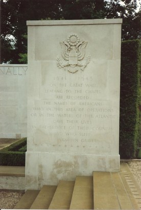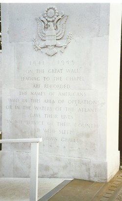 Base of flagpole near Visitors Building: ' TO YOU FROM FAILING HANDS WE THROW THE TORCH - BE YOURS TO HOLD IT HIGH' Above and on pylons on north wall of the memorial: GRANT UNTO THEM O LORD ETERNAL REST/ 1941 1942 1943 1944 1945 Below bronze rope railing on north face balcony: IN GRATEFUL TRIBUTE TO THEIR SACRIFICE AND IN PROUD MEMORY OF THEIR VALOUR Above entrance to memorial: TO THE GLORY OF GOD AND/ IN MEMORY OF THOSE/ WHO DIED FOR THEIR COUNTRY/ 1941 -1945 Above Chapel entrance: INTO THY HANDS O LORD Mosaic inside chapel: HE RESTORETH MY SOUL, HE MAKETH ME TO LIE DOWN IN GREEN PASTURES Around the chapel ceiling: IN PROUD AND GRATEFUL MEMORY OF THOSE MEN OF THE UNITED STATES ARMY AIR FORCE WHO FROM THESE FRIENDLY ISLES FLE THIER FINAL FLIGHT AND MET THEIR GOD. THEY KNEW NOT THE HOUR THE DAY NOR THE MANNER OF THEIR PASSING. WHEN FAR FROM HOME THEY WERE CALLED TO JOIN THAT HEROIC BAND OF AIRMEN WHO HAD GONE BEFORE. MAY THEY REST IN PEACE. Altar rail: FAITH HOPE Tablets of the Missing: THE AMERICANS, WHOSE NAMES HERE APPEAR,/ WERE PART OF THE PRICE THAT FREE MEN/ FOR THE SECOND TIME IN THIS CENTURY/ HAVE BEEN FORCED TO PAY TO DEFEND/ HUMAN LIBERTY AND RIGHTS/ ALL WHO SHALL HEREAFTER LIVE IN FREEDOM/ WILL BE HERE REMINDED THAT TO THESE MEN AND THEIR COMRADES/ WE OWE A DEBT TO BE PAID/ WITH GREATFUL REMEMBRANCE OF THEIR SACRIFICE/ AND THE HIGH RESOLVE THAT THE CAUSE FOR WHICH THEY DIED/ SHALL LIVE ETERNALLY