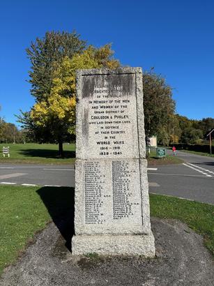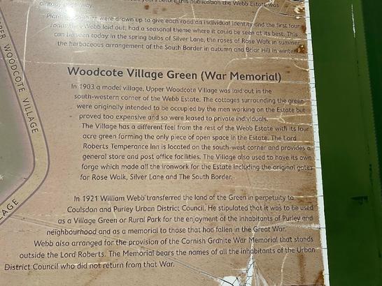 6 O'clock face: This village green is dedicated to the use of the public in memory of the men and women of the urban district of Coulsdon & Purley who laid down their lives in defence of their country in the World Wars 1914 - 1918/ 1939 - 1945 (names)