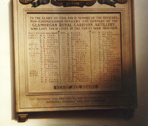 TO THE GLORY OF GOD AND IN MEMORY OF THE OFFICERS/ NON-COMMISIONED OFFICERS AND GUNNERS OF THE/ GLAMORGAN ROYAL GARRISON ARTILLERY/ WHO LOST THEIR LIVES IN THE GREAT WAR 1914-1918/ (NAMES)/ READY AYE READY/ THIS MEMORIAL WAS ERECTED BY THE OFFICERS NON COMMISSIONED/ OFFICERS GUNNERS AND OLD COMRADES