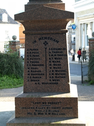 North Facing Panel: IN HONOUR OF THE MEN/OF HALESWORTH/WHO FELL IN THE/ GREAT WAR/1914 - 1918/ GREATER LOVE HATH NO MAN THAN THIS/1939 - 1945// West Facing Panel: IN MEMORIAM (Names)/WW2 (Names)// South Facing Panel: IN MEMORIAM/(Names)/"LEST WE FORGET"/CIVILIANS KILLED IN ENEMY ACTION/(Names)// East Facing Panel: IN MEMORIAM/(Names)/WW2 (Names)/