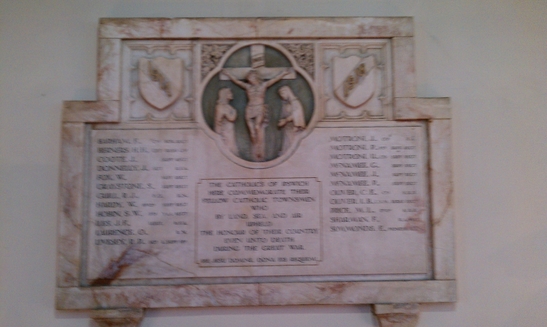 THE CATHOLICS OF IPSWICH HERE COMMEMORATE THEIR FELLOW CATHOLIC TOWNSMEN WHO BY LAND AND AIR UPHELD THE HONOUR OF THEIR COUNTRY EVEN UNTO DEATH DURING THE GREAT WAR DOMINE PIE JESU DONA EIS REQUIEM