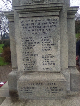 WW1- South Face- Column 1- S AGNEW/H AMBLER/JC ANDERSON/JN ARNOTT/C ASKEW/F BARKER/L BERESFORD/J BIRD/E BIRD/ED BIRNIE/RC BLAIR/H BLAIR/W BLAIR Column 2- S BOWES/J BOYLE/W BROWN/JT BROWN/J BYRNE/R BURNS/J CAHILL/M CASSIDY/T CAPE/J CARTER/JH CRANE M DACRE West Face- Column 1- JM STAMPER/H TEMPLETON/R TEMPLETON/WH THOMAS/T TINKLER/H TOFT/J TWEDDLE/J TYSON/C UHRIG J WARD/W WARDROP/T WARREN/M WATSON/J WAUGH/J WESTNAGE/A WHITE/G WHITEHEAD Column 2- M WILLIAMSON/E WILSON/H WILSON/J WILSON/W WOODBURN/H WRIGHT/A WYPER North Face- Column 1- JR LITTLE/WH MCCLURE/D MCCORD/D MCGEORGE/T MCGLENNON/W MCKEE/A MCCLENNAN/A MCMULLEN/ J MCNICHOLAS/H MASON/W MILLICAN/J MOORE/WH MOORE/G MORTON/J MORTON/J MURPHY/T NEEN/ J O’NEIL Column 2- G PAISLEY/I PARK/W PARKER/JJ PALMER/FH PICKARD/J POOLE/GF PRICE/TP PRICE/R PRITT/A RAE/J RAE H REECE/R RICE/P RODGERS/JW ROBINSON/T SCOTT/W SCRUGHAM/N SIMON/T SPOONER East Face- Column 1- H DALTON/JTP DAWSON/G DITCHBURN/E DIXON/NG DOBSON/B DOLLIGAN/W DORAN/M DOUGLAS/H FALCON JJ FEARON/J FEARON/J FERRY/H FLYNN/TH FRAZER/T GILMORE/W GILMORE/T GORRY/J GREENAN Column 2- WJ HALL/WH HARDON/J HARRISON/J HEAD/J HEWSON/TB HEWSON/A HILL/A HODGSON/J HUNTER/TB HUGHES A INMAN/JW INMAN/D JACKSON/W JACKSON/H JEFFREY/G JOHNSTON/J KEENAN WW2- South Face- Column 1- JW BOWES/M BOWES/J COWEN Column 2-HL DEANS/TM DICKINSON/J ELLWOOD West Face- Column 1-J FERRY/W FINDLAY/HM GOULDING/G GRAHAM Column 2-F GRIFFITHS/TA HEPPLE/JC HINDMOOR/J IRVING North Face- Column 1- RB SCARROW/W SHANNON/H SHERWEN/WS STABLER Column 2-JW TUBMAN/E WALKER/GLADYS WATERS East Face- Column 1-R IRVING/JJ JOHNSTONE/D JACKSON/RA JAMIESON Column 2-JR MCEUAN/S MCCULLOUGH/J PEARSON/WW SAFFILL