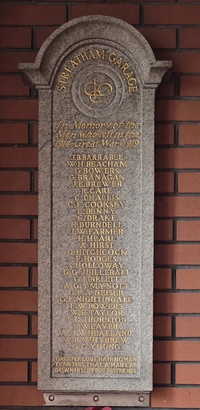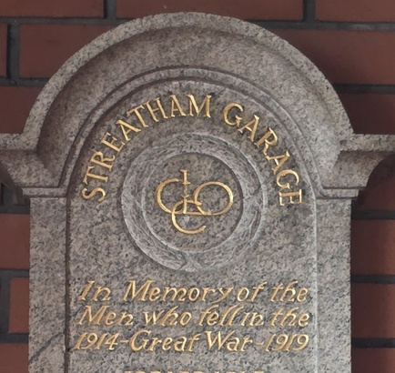STREATHAM GARAGE/ IN MEMORY OF THE/ MEN WHO FELL IN THE/ 1914 GREAT WAR 1919/ (names)/ GREATER LOVE HATH NO MAN/THAN THIS THAT A MAN LAY/ DOWN HIS LIFE FOR HIS FRIENDS
